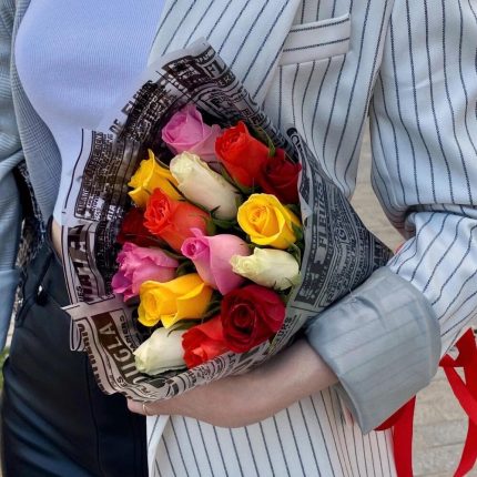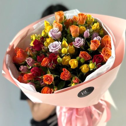 Яркий комплимент: яркие цветы в сумочке (лизиантус, красная роза, пионовидная кустовая роза”