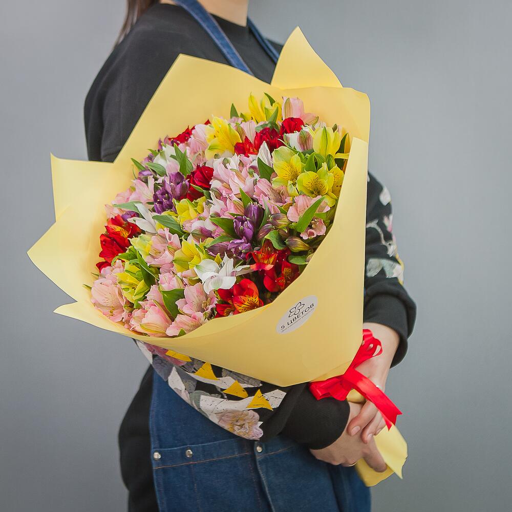 Альстромерия розовая – 10 шт.Альстромерия красная – 10 шт.Альстромерия желтая – 9 шт.Упаковка крафт – 1 шт.Атласная лента – 1 шт.