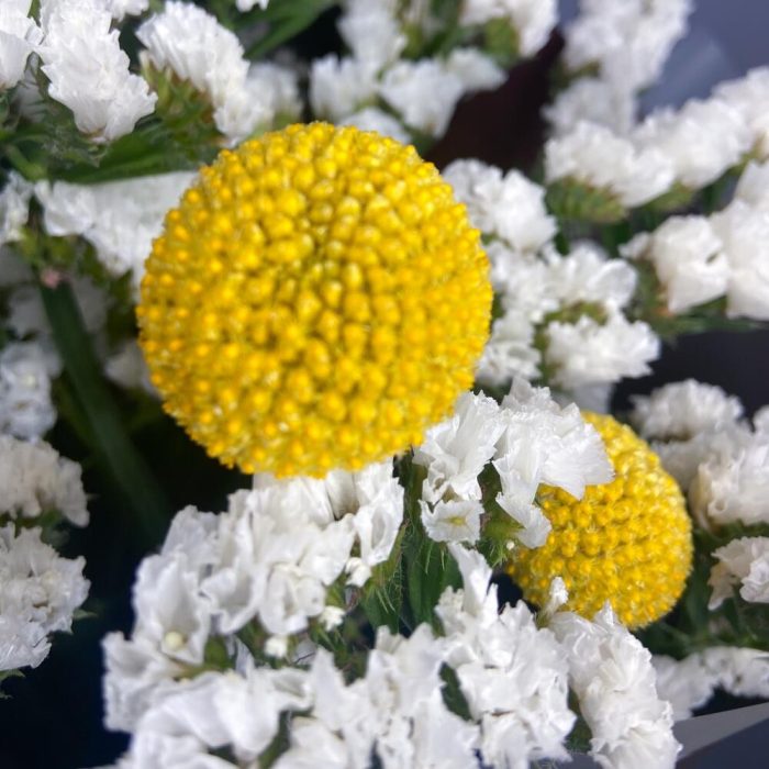 Упаковка – 1 шт.Статица белая – 3 шт.Краспедия желтая – 3 шт.Сафари бордовая – 3 шт.