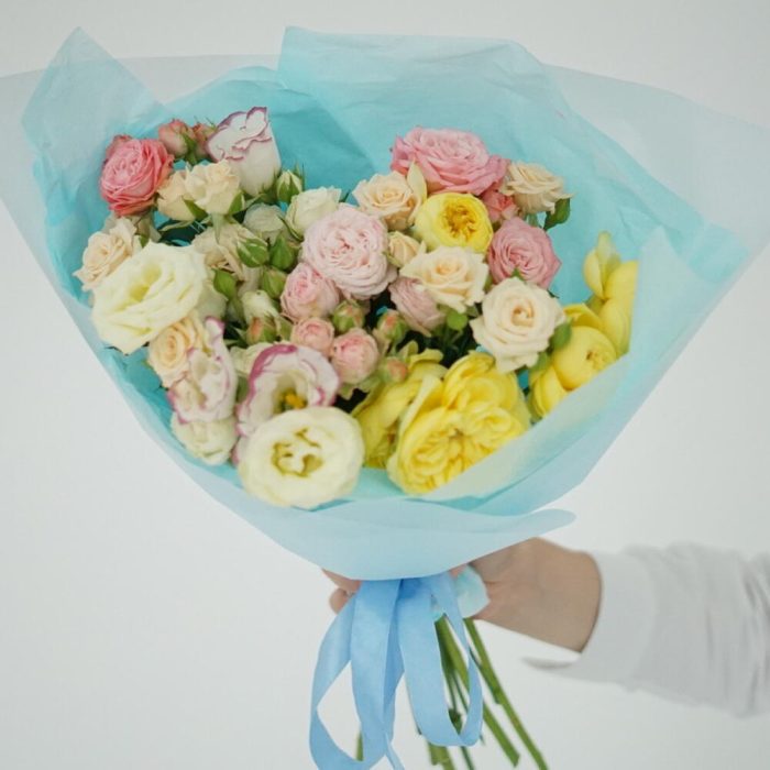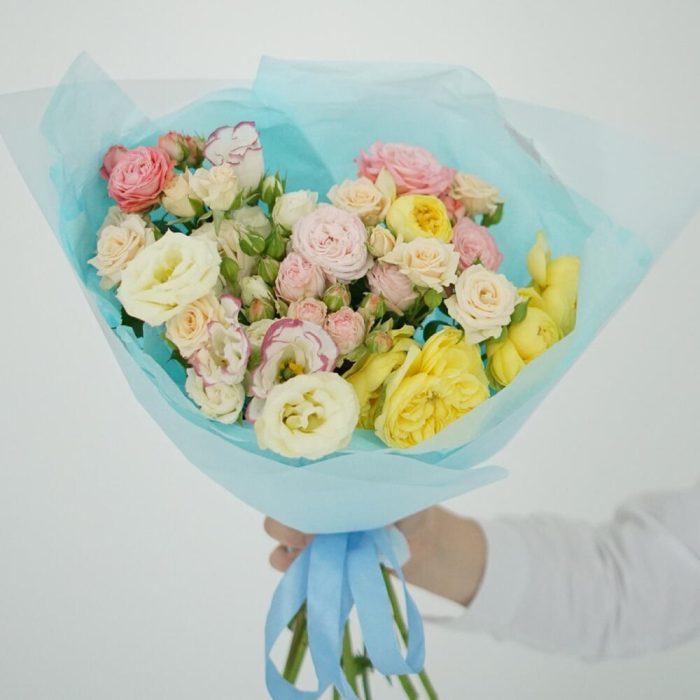 peony spray rose – 7 шт. Lisianthus – 3 шт. gift message card – 1 шт. packaging design – 2 шт. care instruction – 1 шт. free delivery – 1 шт.
