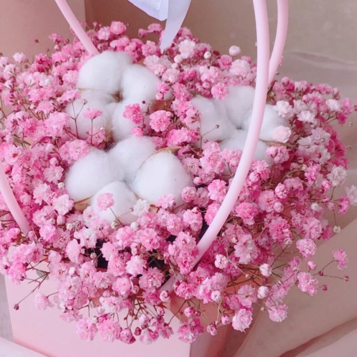 Очаровательная композиция из изысканных свежих цветов.Наполнена множеством соцветий розовой гипсофилы и мягкого хлопка. Собрана в стильной сумочке.Композиция из гипсофилы – необычный подарок, который удивит своей невероятной стойкостью, при правильном и простом уходе.❤️ Ставить композицию в прохладном месте, избегая отопительных приборов и прямых солнечных лучей. ❤️ Подливать немного воды в серединку.Гипсофила не вянет, а становится сухоцветом, сохраняя свой вид. Поэтому композиция продолжит радовать ещё очень долго!Чтобы защитить готовый букет во время доставки от любых погодных условий, мы бережно его упаковываем