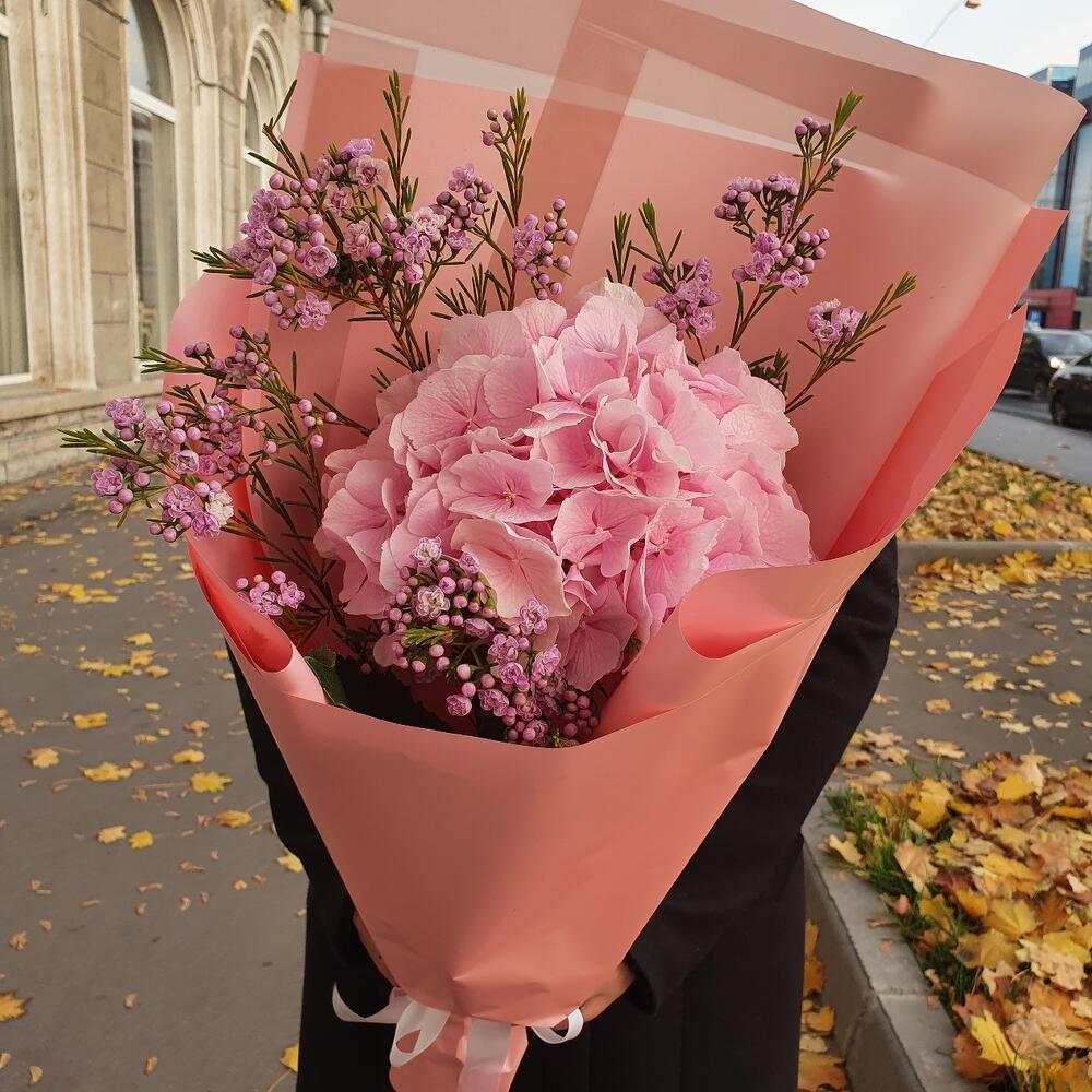 Гортензия розовая – 1 шт.Ваксфлауэр – 1 шт.Упаковка дизайнерская – 1 шт.Лента атласная – 1 шт.