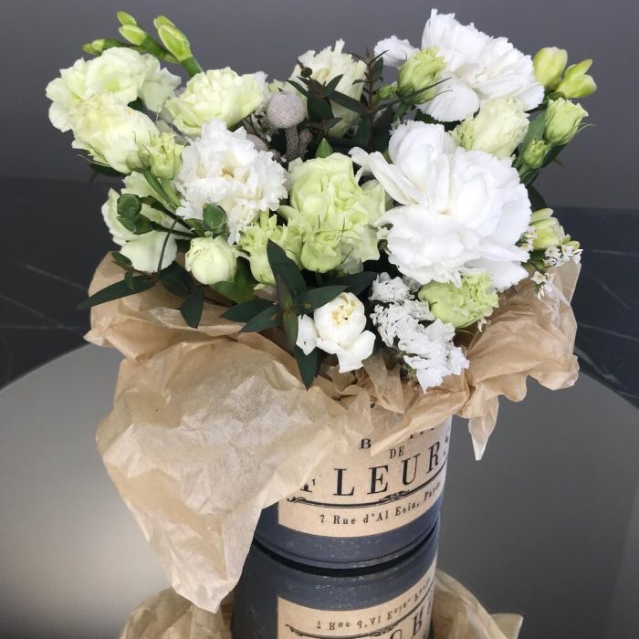 Лизиантус – 1 шт.Фрезия – 2 шт.Гвоздика – 2 шт.Гвоздика кустовая – 2 шт.Жестяное кашпо – 1 шт.комплимент от polyanka – 1 шт.
