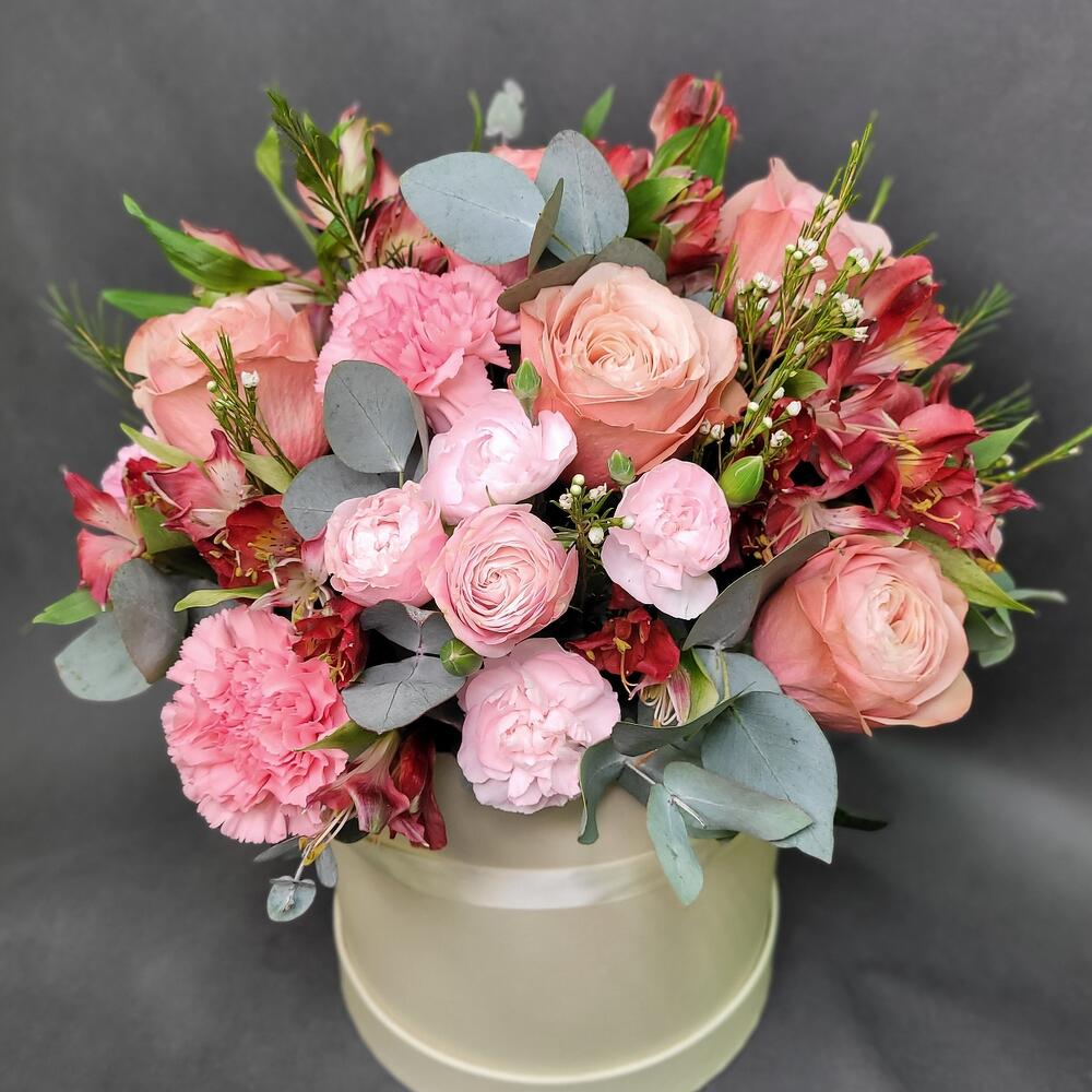 Роза Эквадор – 5 шт.Роза кустовая пионовидная – 2 шт.Диантус – 5 шт.Альстромерия – 3 шт.Диантус кустовой – 3 шт.зелень декоративная – 5 шт.Шляпная коробка – 1 шт.Оазис флористический – 1 шт.