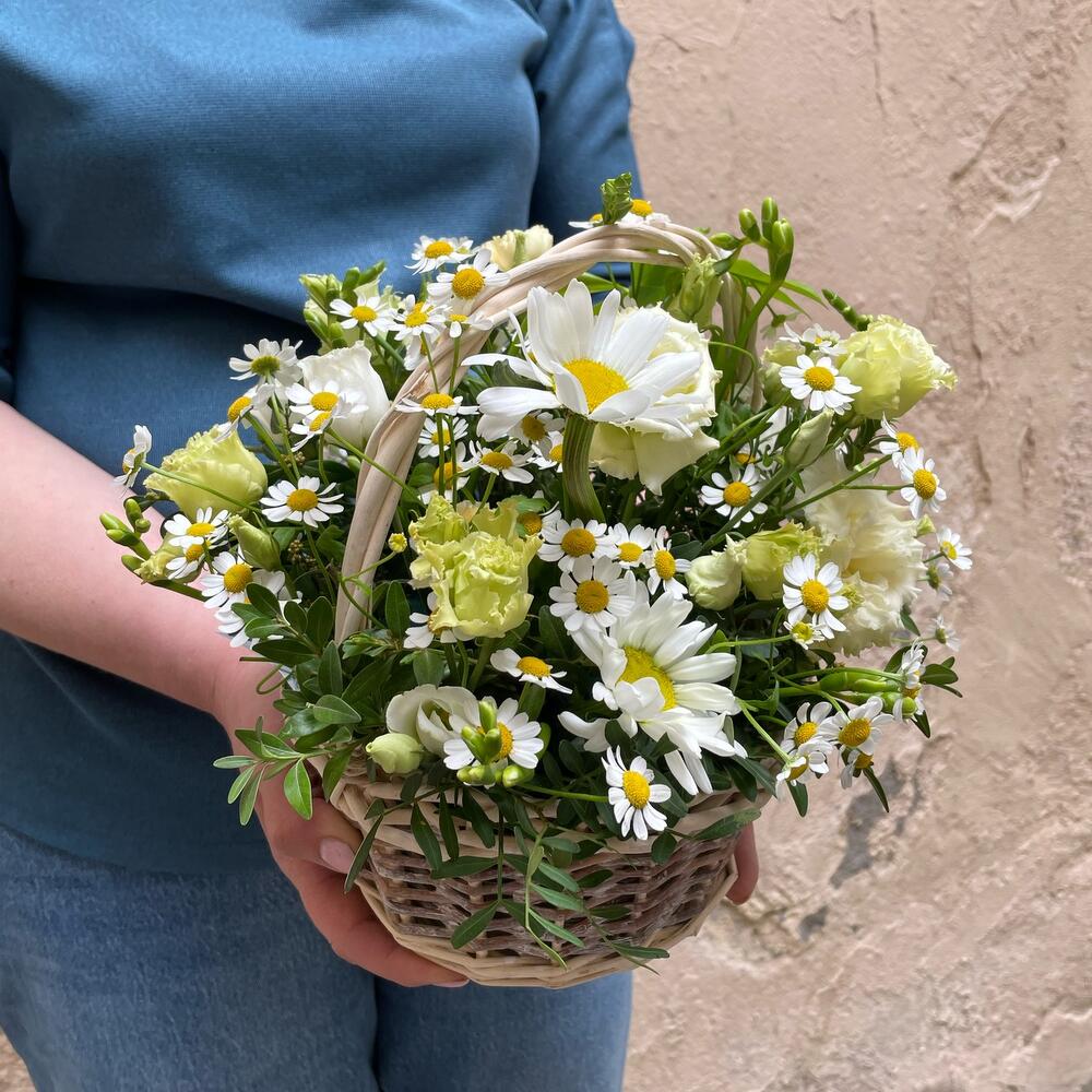 Лизиантус – 1 шт.Корзина – 1 шт.Ромашка – 2 шт.Матрикария – 2 шт.Фисташка – 2 шт.Чойсия – 1 шт.Гвоздика кустовая – 1 шт.