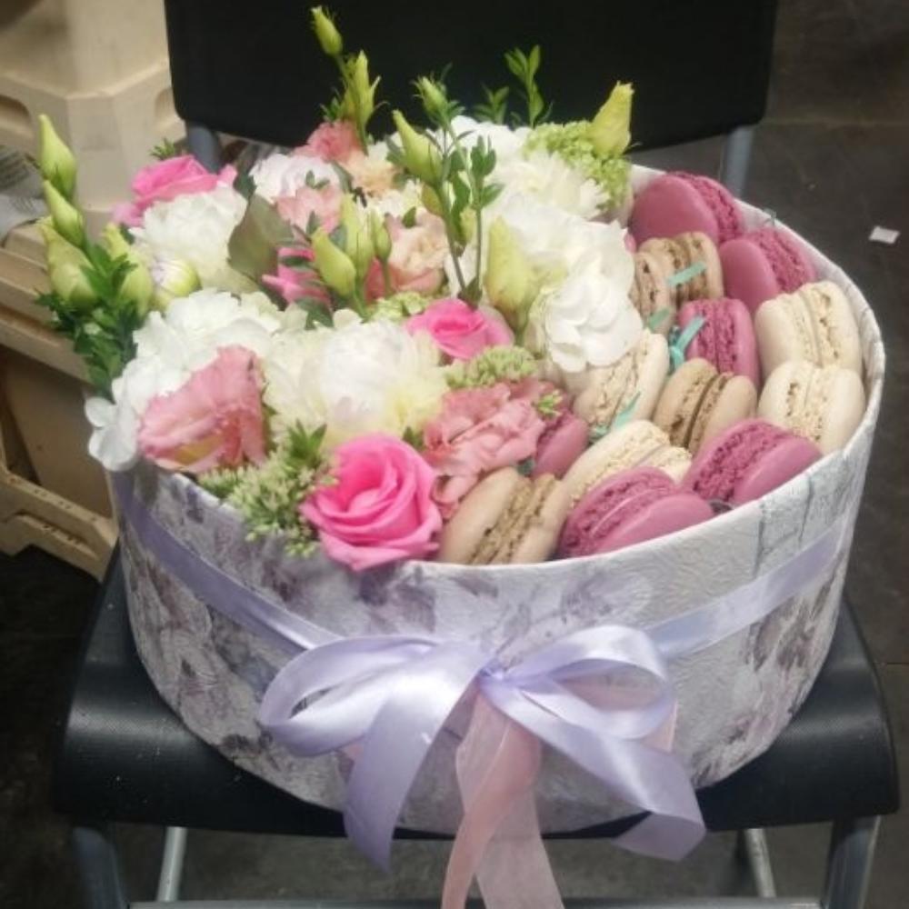 маккаруны – 15 шт.розы – 9 шт.Эустома – 5 шт.Коробка шляпная – 1 шт.