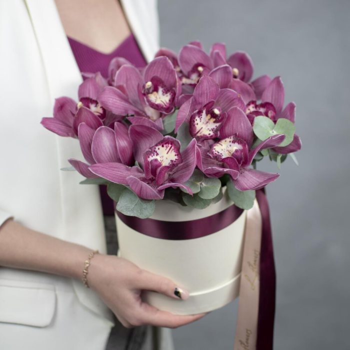 орхидея cymbidium – 11 шт.эвкалипт cinerea – 5 шт.Коробка шляпная – 1 шт.