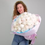 Лента атласная – 2 шт.Пион белый – 51 шт.Кризал (подкормка) – 1 шт.Пленка матовая – 3 шт.Аквапак – 1 шт.Фоамиран (упаковка) – 3 шт.инструкция по уходу за цветами – 1 шт.хорошее настроение в подарок – 1 шт.