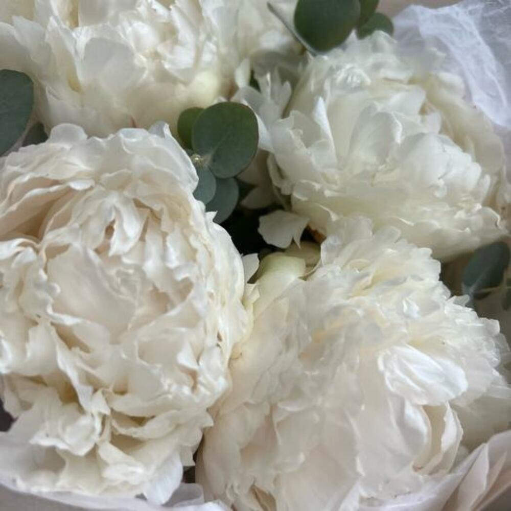Эвкалипт – 5 шт.Атласная лента – 1 шт.декоративная упаковка – 1 шт.пионы – 5 шт.