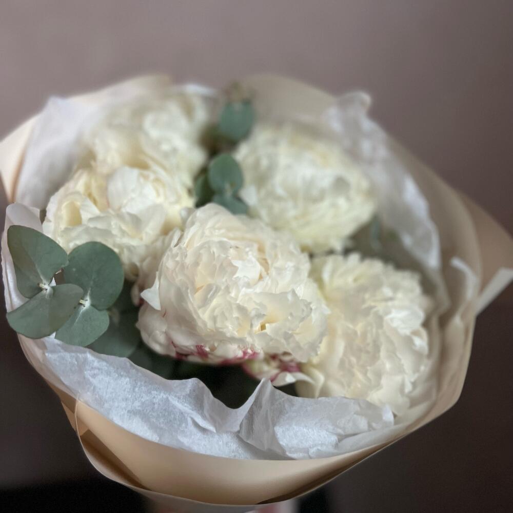 Эвкалипт – 5 шт.Атласная лента – 1 шт.декоративная упаковка – 1 шт.пионы – 5 шт.