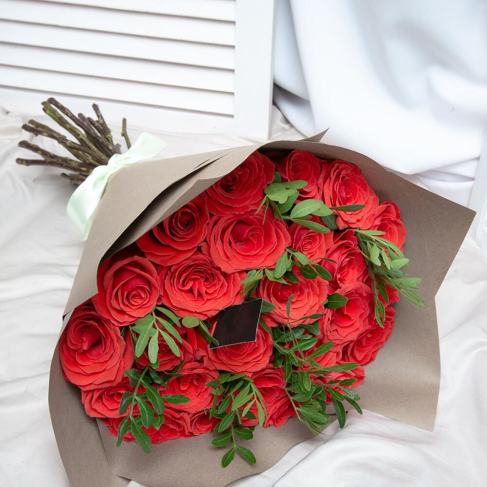 25 ярко-красных роз с фисташкой в крафте