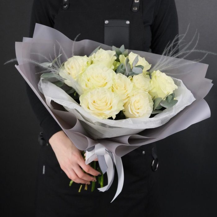 9 белых роз Мондиаль с эвкалиптом