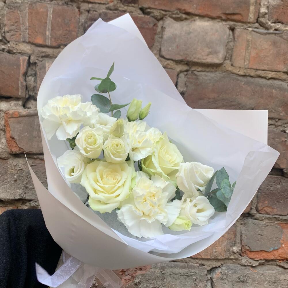 Лизиантус – 1 шт.Роза – 2 шт.Гвоздика – 3 шт.Упаковка дизайнерская – 1 шт.