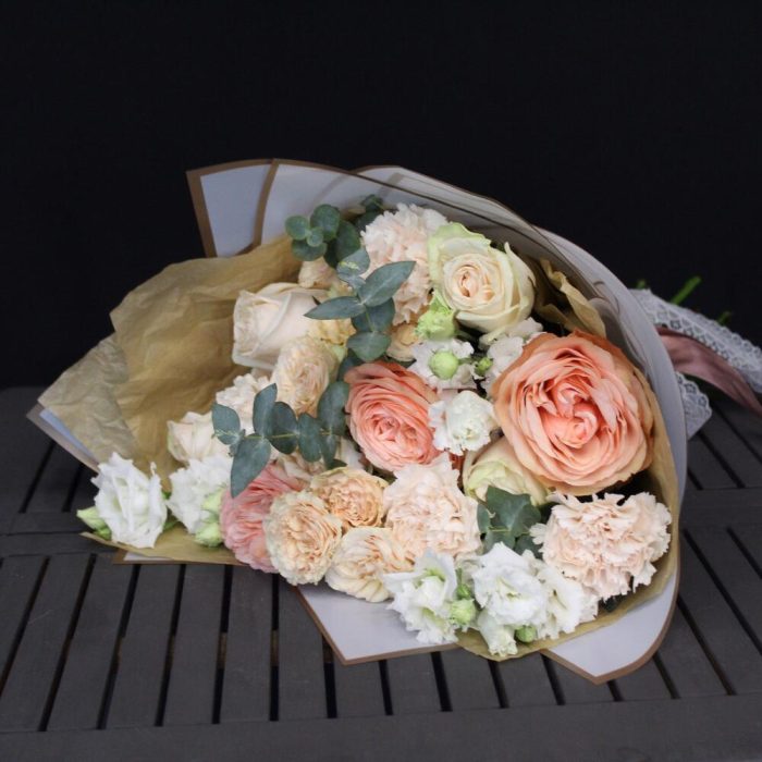 роза вайт о хара( ароматная) – 5 шт.трендсеттер роза кустовая – 2 шт.Роза кахала пионовидная – 3 шт.эустома алиса вайт – 3 шт.Диантус – 4 шт.Эвкалипт – 2 шт.Тишью – 2 шт.Пленка матовая – 3 шт.Лента атласная – 2 шт.