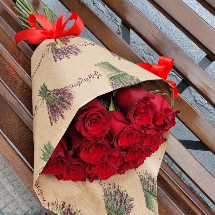 Роза Эквадор 60 см – 21 шт.Крафт – 1 шт.Лента атласная – 1 шт.