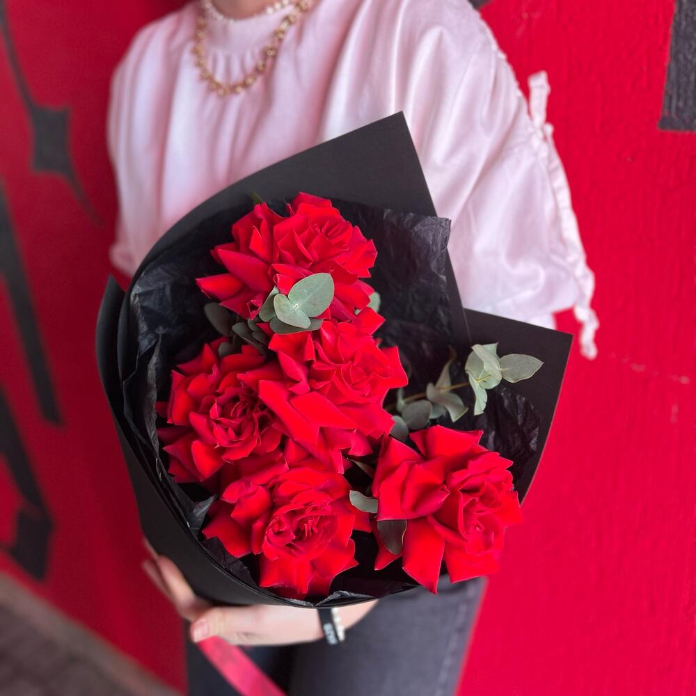 Эвкалипт – 1 шт.Лента атласная – 1 шт.Тишью – 1 шт.фоамиран черный – 1 шт.роза красная французская – 5 шт.