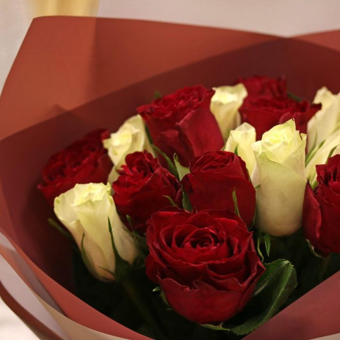 Букет из 15 красной и белой розы микс 35-40 см (Кения) в стильной упаковке
