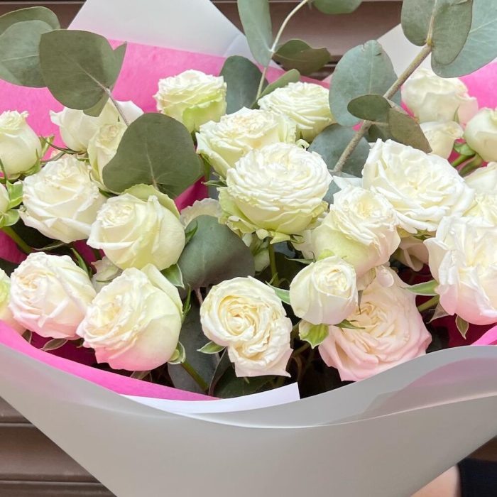 Эвкалипт – 4 шт.Лента атласная – 1 шт.Кустовая роза Бомбастик – 5 шт.Тишью – 1 шт.Пленка матовая – 2 шт.