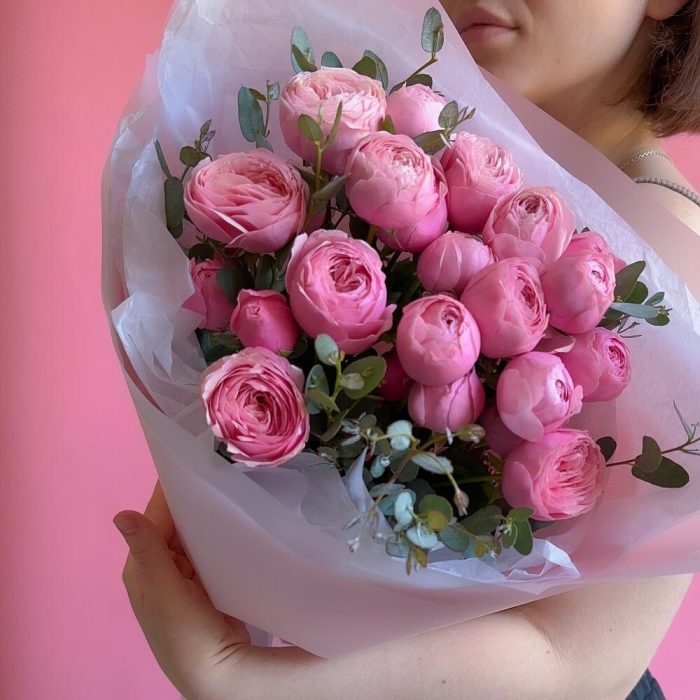 Букет из кустовой пионовидной розы и эвкалипт