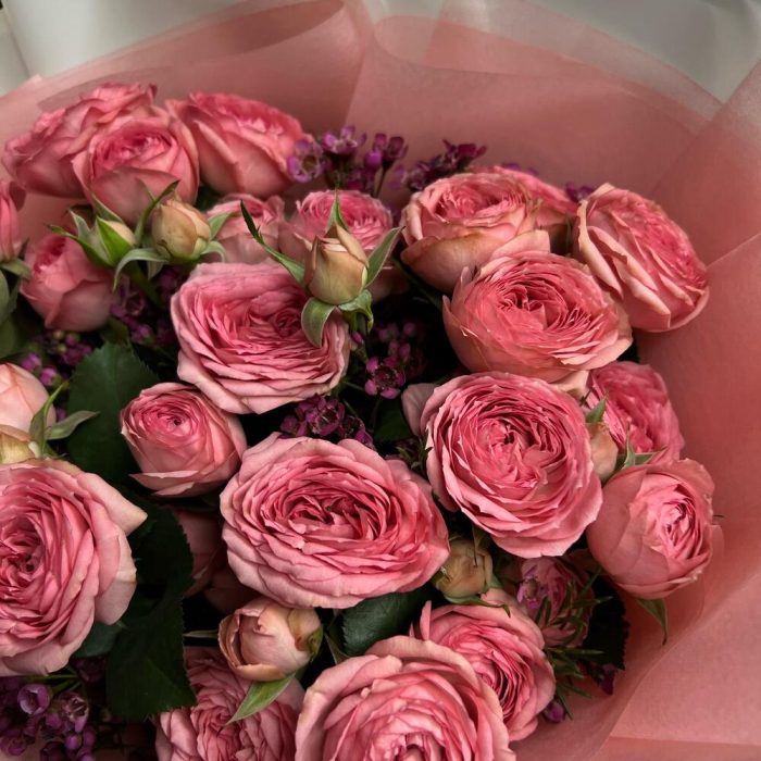 Кустовая пионовидная роза – 7 шт.Хамелациум – 3 шт.декоративная упаковка – 1 шт.Атласная лента – 1 шт.