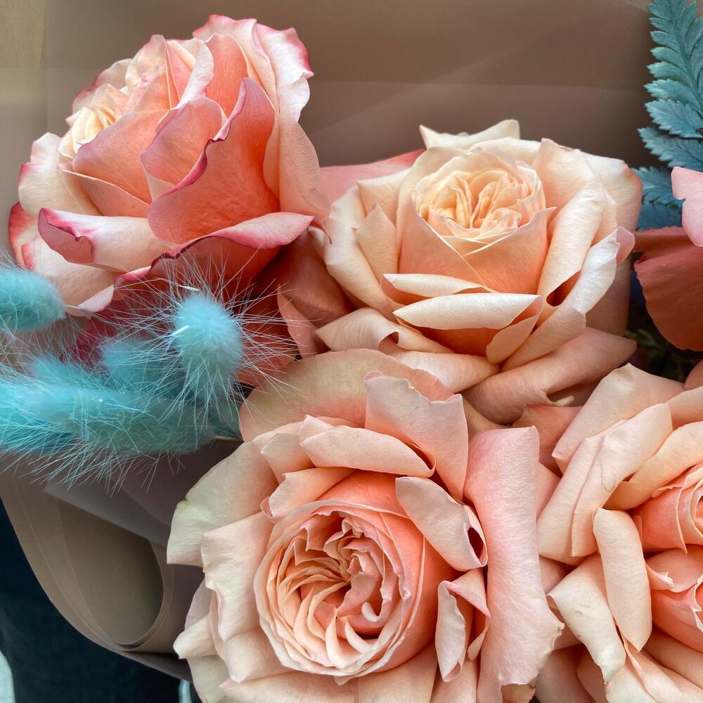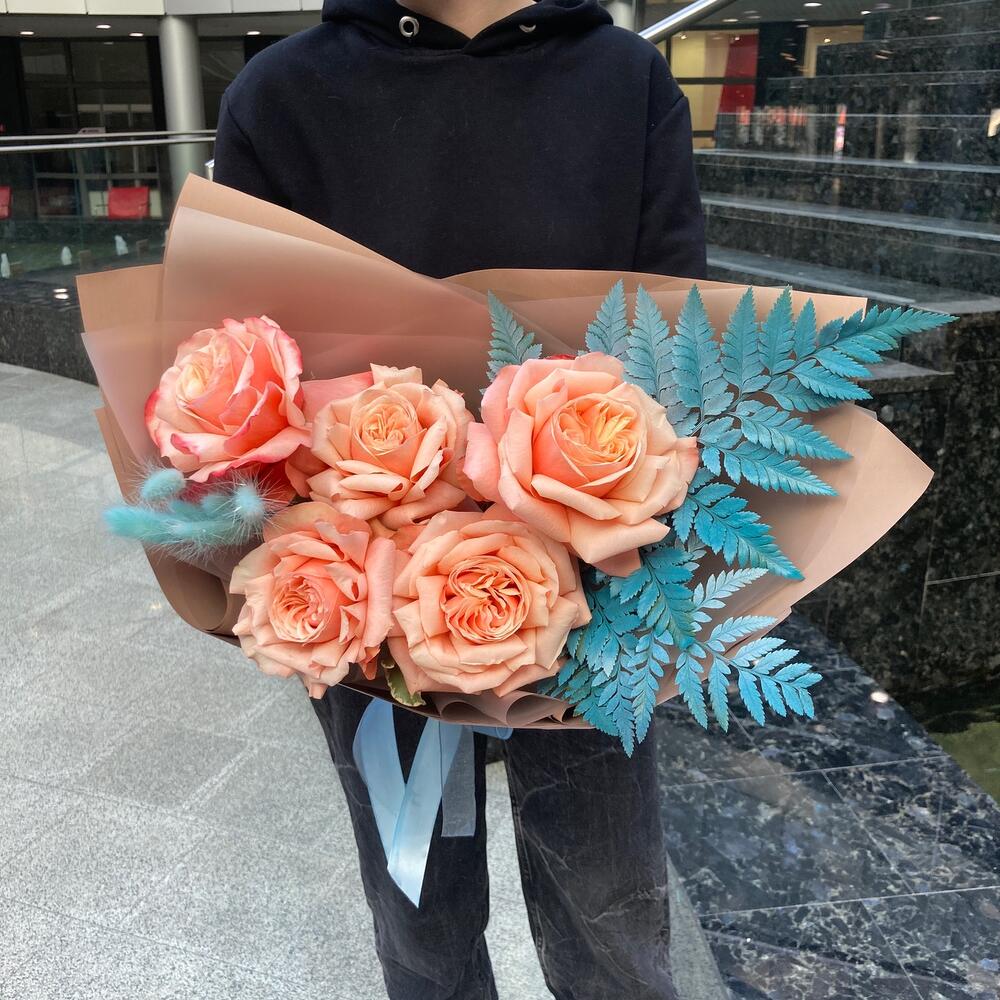 Роза – 5 шт.Лагурус – 5 шт.Папоротник – 2 шт.Лента – 2 шт.Упаковка дизайнерская – 2 шт.