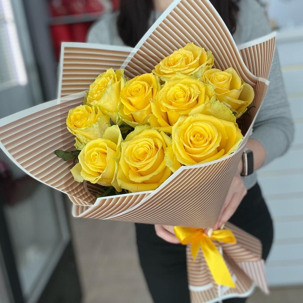 Упаковка – 1 шт.Лента атласная – 1 шт.Роза желтая 50 см – 9 шт.Открыточка с вашими пожеланиями – 1 шт.