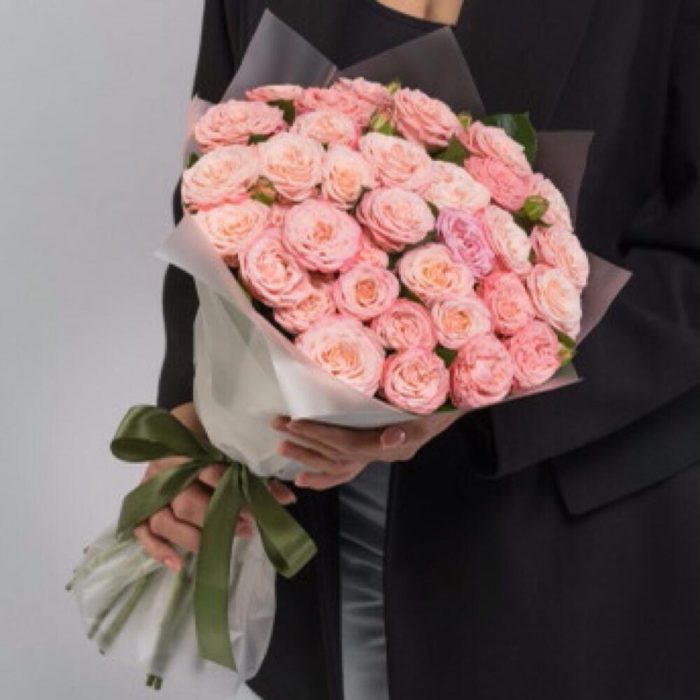 Букет из розовых гвоздик, пионовидных роз, эустом