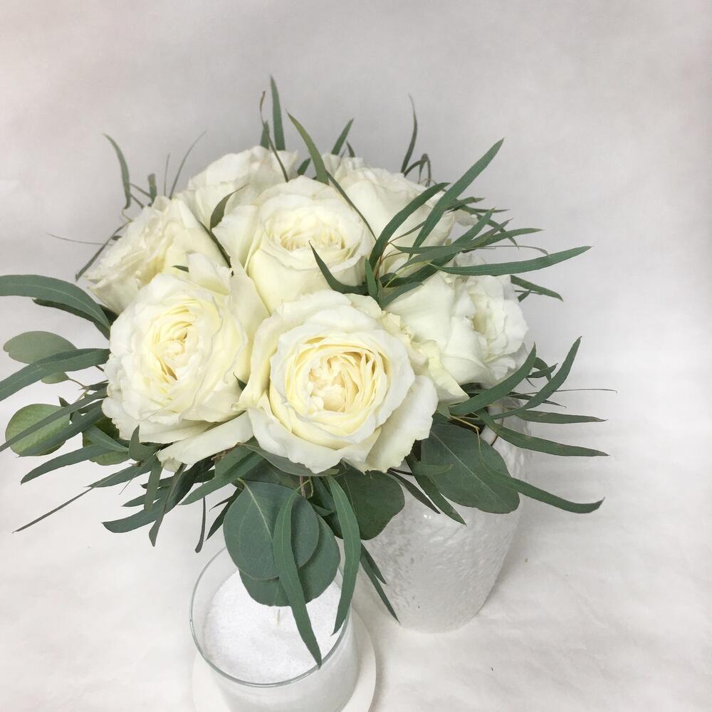 Пионовидная роза – 7 шт.эвкалипт populus – 3 шт.эвкалипт nicole – 3 шт.Лента атласная – 3 шт.
