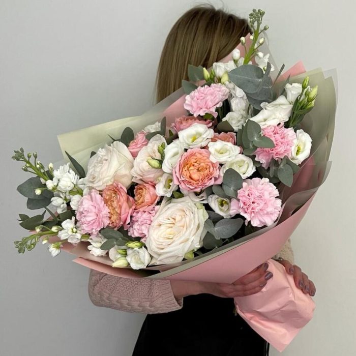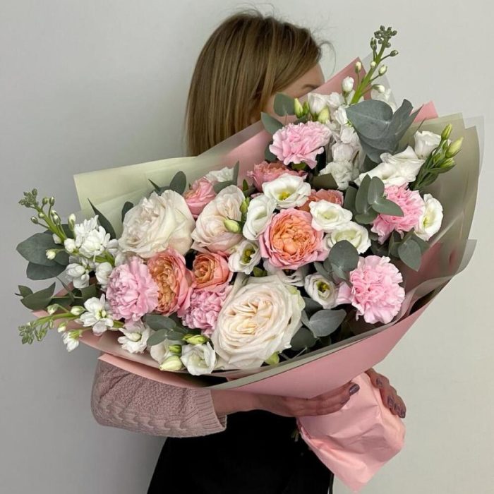 Лизиантус – 2 шт.Маттиола – 3 шт.Эвкалипт – 3 шт.Роза Эквадор – 3 шт.Диантус – 5 шт.Фисташка – 3 шт.Упаковка дизайнерская – 3 шт.роза пионовидная кустовая джульетта – 2 шт.