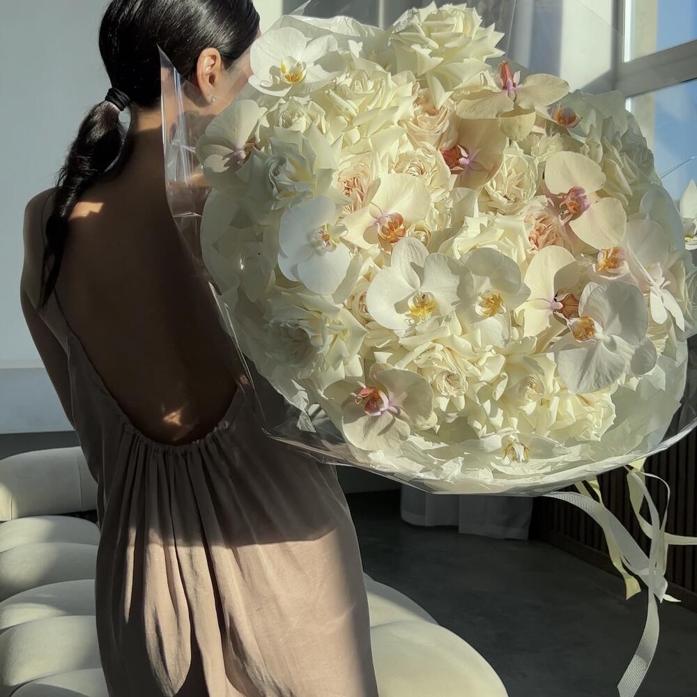 роза пионовидная плая бланка – 36 шт.Орхидея Фаленопсис – 19 шт.тишью кремовое – 1 шт.Слюда – 1 шт.открытка брендированная в подарок – 1 шт.