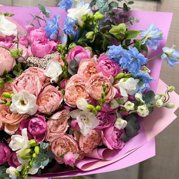 роза кустовая пионовидная «джульетта» – 5 шт.роза кустовая пионовидная «джульетта принцесса» – 9 шт.Фрезия белая – 9 шт.Озотамнус – 1 шт.Хелеборус – 2 шт.Ваксфлауэр белый – 1 шт.Дельфиниум голубой – 4 шт.Эвкалипт – 10 шт.Подарочная упаковка – 1 шт.Лента атласная – 4 шт.