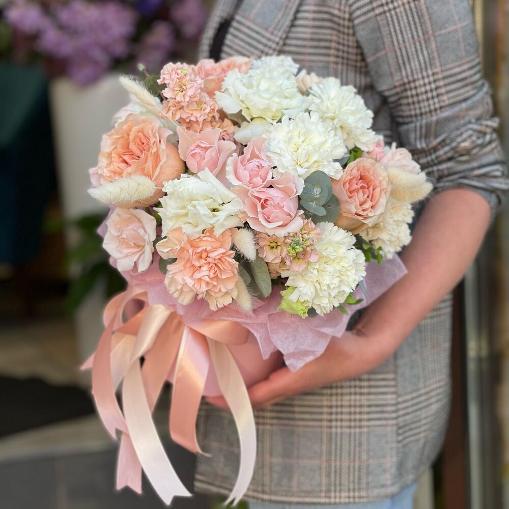 Лента – 1 шт.Лизиантус – 1 шт.Маттиола – 3 шт.Роза кустовая – 3 шт.Эвкалипт – 1 шт.Роза одноголовая – 3 шт.Тишью – 1 шт.Коробка шляпная – 1 шт.Лагурус – 8 шт.Оазис флористический – 1 шт.Гвоздика одноголовая – 7 шт.