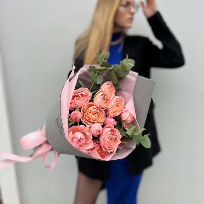 Лента – 1 шт.Тишью – 1 шт.Эвкалипт цинерея – 1 шт.Фоамиран (упаковка) – 1 шт.Роза кустовая джульетта – 3 шт.