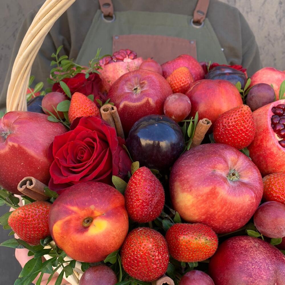 Клубника – 250 гр.Корица – 10 шт.Роза красная – 6 шт.Лента атласная – 2 шт.Гранат – 2 шт.Фисташка – 3 шт.Корзина плетеная – 1 шт.Оазис флористический – 2 шт.яблоко красное – 7 шт.черешня или виноград – 200 гр.нектарин или слива – 6 шт.