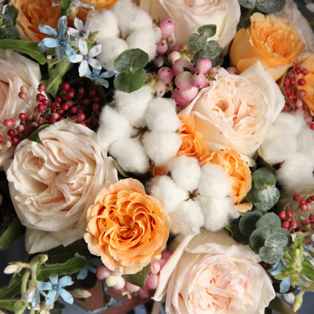 Букет с хлопком, пионовидными розами, твидией, снежноягодником и эвкалиптом.Стильное цветочное решение длялюбого случая.Ширина букета около 50 сантиметров, высота букета около 50 сантиметров.