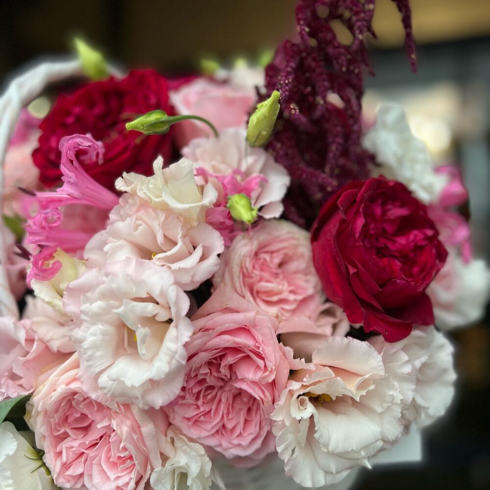 Корзина с цветами пионовидными Розами и Лизиантусом