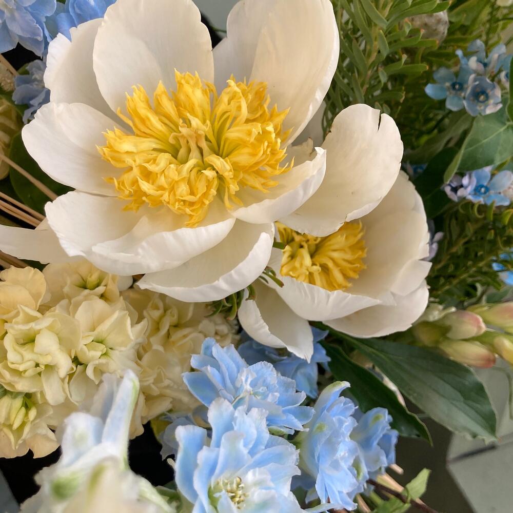 Летели облака – Букет с пионами и дельфиниумом