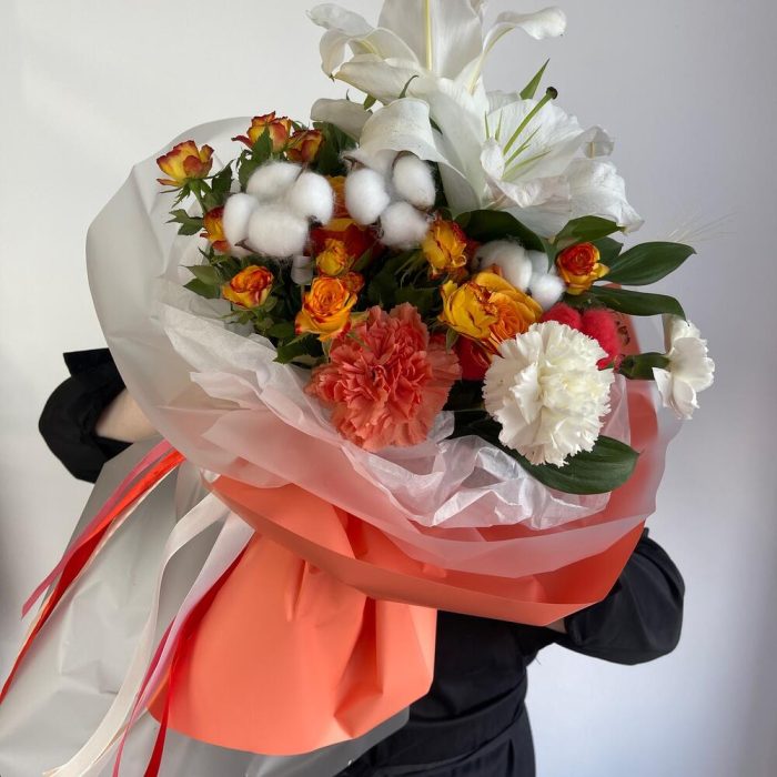 Роза Оранж – 2 шт.Кустовая роза – 2 шт.Фисташка – 4 шт.Лилия белая – 1 шт.Пленка матовая – 6 шт.Хлопок натуральный – 2 шт.Диантус сортовой – 3 шт.