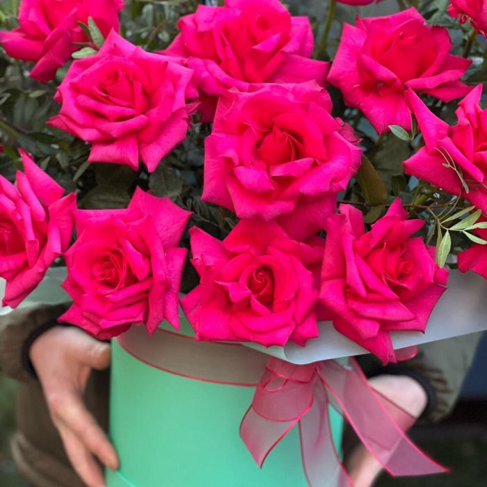 Роскошная композиция из малиновых роз в шляпной коробке удобный и практичный подарок на любой праздник для ваших близких
