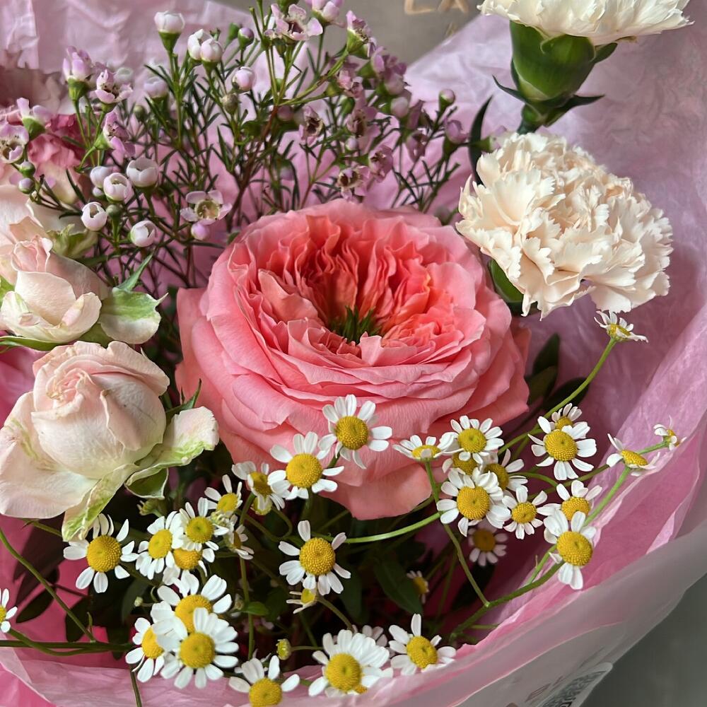 Пионовидная роза – 1 шт.Диантус – 2 шт.Кустовая роза – 1 шт.Ваксфлауэр – 2 шт.Эустома – 1 шт.Матрикария – 1 шт.Упаковка дизайнерская – 1 шт.