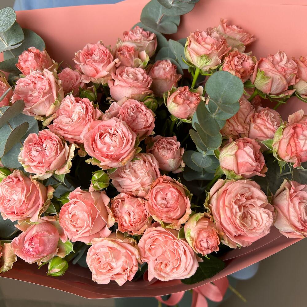 Огромный букет кустовых пионовидных роз с ароматным эвкалиптом.