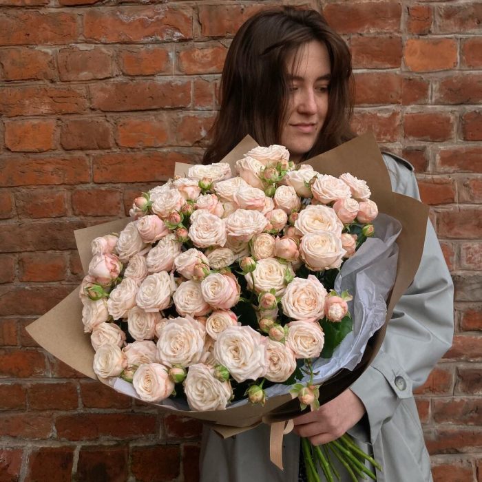 Нежная охапка кустовых пионовидных роз – Бомбастик.Стильное цветочное решение для любого случая.Букет приедет в подарочной коробке, с рекомендациями по уходу за цветами.При необходимости, если букет с нежными цветами или ему предстоит весомое время в дороге – то цветы мы отравляем на воде, останется лишь аккуратно снять кулёчек с водой и поставить букет в подходящую вазу.К каждому букету мы подписываем открытку с вашим посланием – эта услуга, так же в подарок.