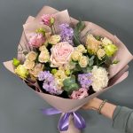 Лизиантус – 4 шт.Маттиола – 3 шт.Роза кустовая – 2 шт.Эвкалипт – 1 шт.Роза одноголовая – 1 шт.Гвоздика – 1 шт.