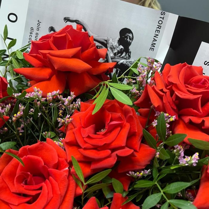 Лимониум – 3 шт.Лента атласная – 3 шт.упаковка дизайнерская пленка – 1 шт.фисташка зелень – 5 шт.роза французская алая премиум нина – 7 шт.