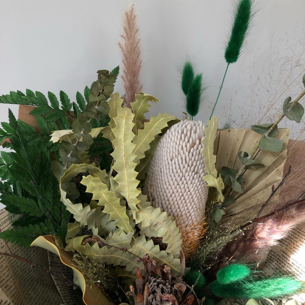 Банксия – 1 шт.Лагурус – 8 шт.Папоротник – 1 шт.пампас – 2 шт.Пальма – 1 шт.Эвкалипт – 1 шт.березовые ветки – 1 шт.михла грас – 1 шт.Упаковка дизайнерская – 1 шт.