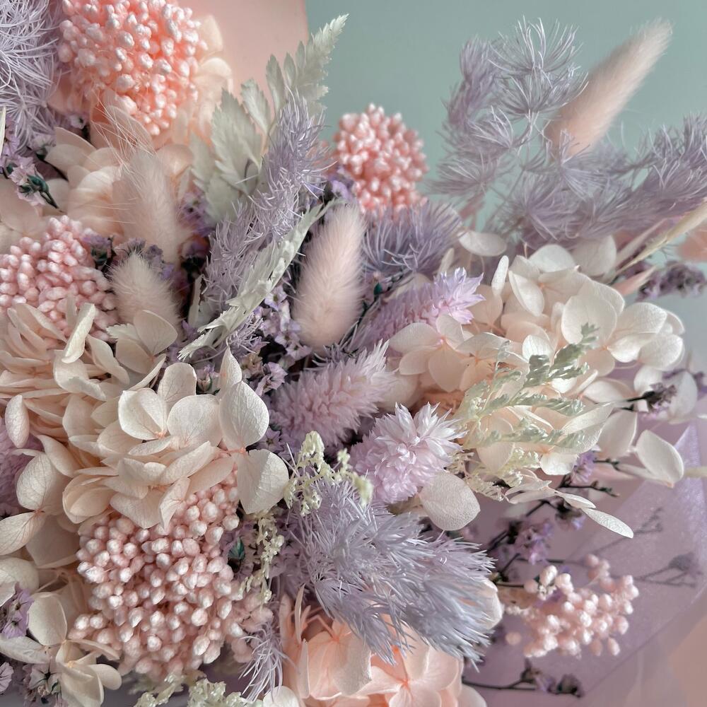«Лавандовое созвездие» Букет из розы, гвоздики, статица и хлопка