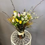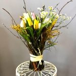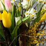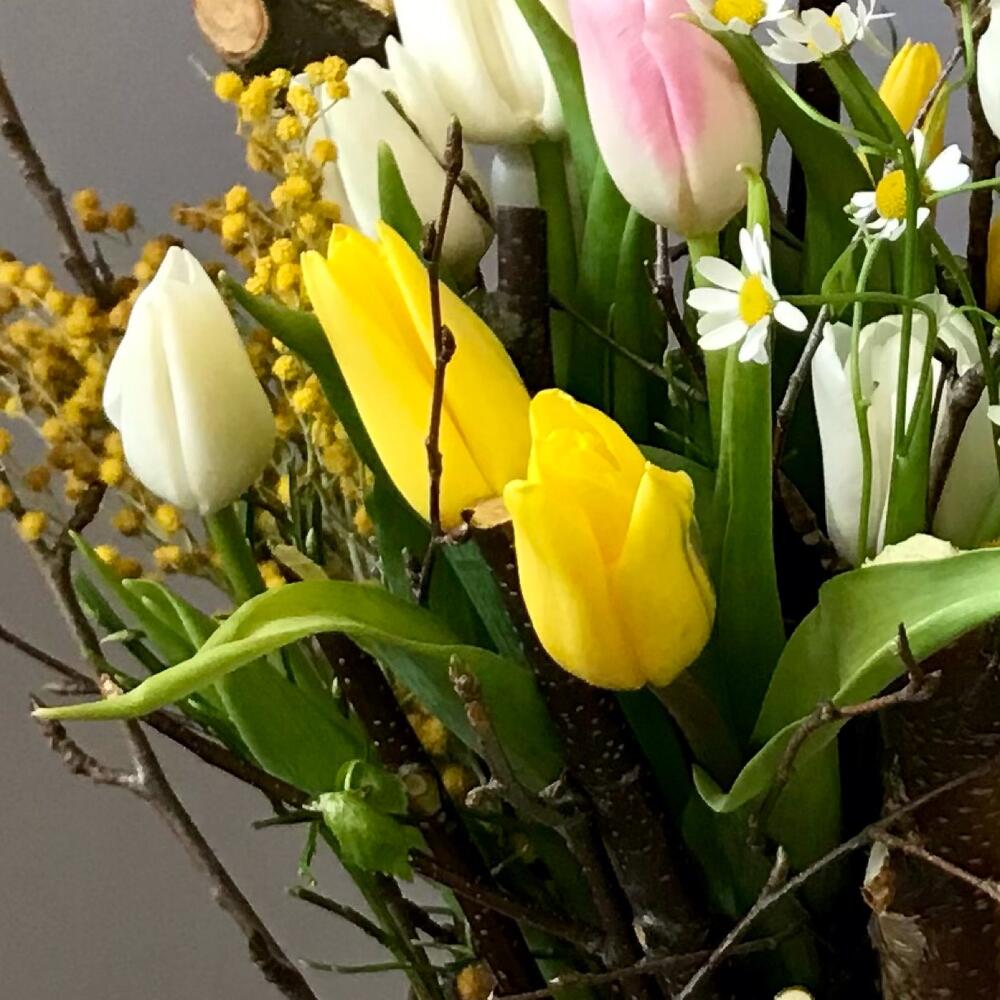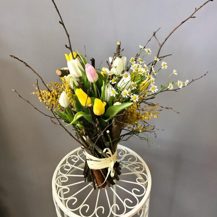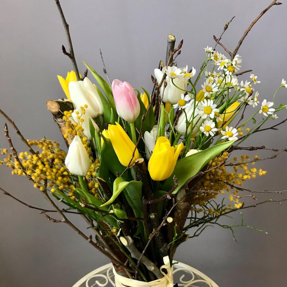 тюльпаны – 15 шт.Матрикария – 2 шт.мимоза или гипсофила желтого цвета – 1 шт.березовые ветки – 20 шт.